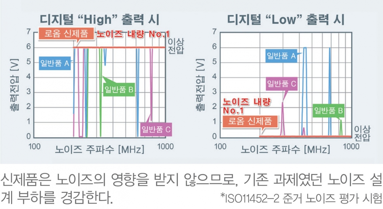 EV와 HEV의 보급, 자동차의 안전성, 편리성 향상을 위해 자동차의 전장화가 가속화됨에 따라 자동차의 노이즈 대책이 더욱 중요시되는 오늘날, 이엠아머 시리즈는 새로운 스탠다드 제품이 될 것이다. 앞으로도 로옴은 높은 노이즈 내량 기술을 중내압의 고속 OP Amp와 전원 IC(리니어 레귤레이터) 등으로 전개해 오토모티브 시스템 등의 한 차원 높은 심플한 설계와 고신뢰화에 기여해 나갈 것이다.