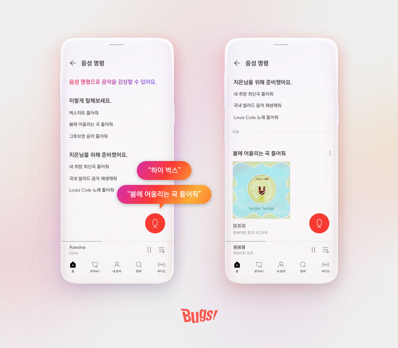벅스는 ‘하이 벅스’ 호출어로 즉시 음성 명령 기능을 시작할 수 있는 ‘음성 호출어’ 기능을 추가했으며, 사용자는 벅스 앱에서 “하이 벅스, 봄에 어울리는 곡 틀어줘”와 같은 음성 명령으로 음악을 들을 수 있게 됐다.