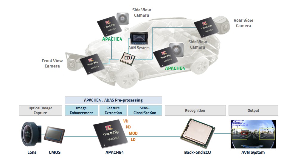 아파치4는 컴퓨터 비젼 알고리즘에 기반한 엣지 프로세서 제품으로, 사람과 차량을 인식·검출해 첨단 운전자 지원시스템(ADAS)에 적합하다. 넥스트칩의 센싱기술과 영상기술의 융합으로 기존 반도체로는 인식이 잘 되지 않았던 80cm 미만의 소아 검출, 코너 케이스에서의 검출, 저조도 시 보행자 검출 등의 문제를 해결해낸 제품이다.