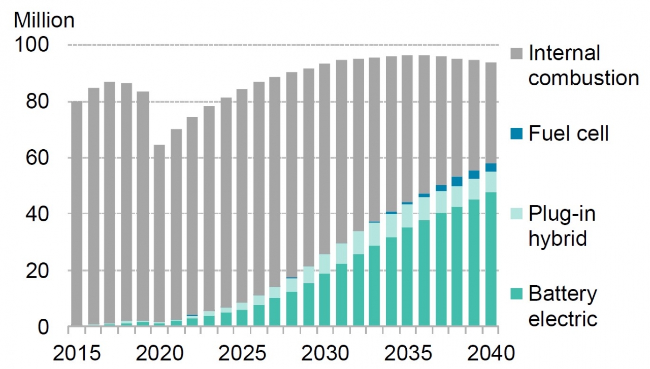 BNEF의 분석에 따르면 내연기관(ICE) 차량의 전세계 판매는 2017년 정점을 찍었고 일시적인 위기 후 회복을 거친 후 장기적인 하락세를 이어갈 것이다. 처음으로, BNEF는 전세계적 인구 구조의 변화, 도시화 및 공유 모빌리티가 경제 개발의 영향보다 더 중요해지면서, 운행 대수는 계속 증가해도, 전체적인 신규 승용차 판매는 2036년에 정점에 달할 것으로 예상했다. 전기 모델은 2020년 전세계 자동차 판매의 3%, 2023년에 약 540만대로 상승하여 7%를 차지할 것으로 예상된다.