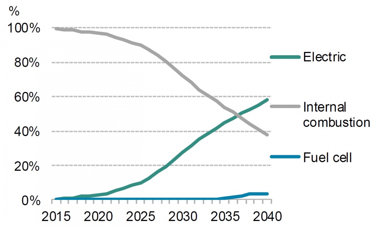 BNEF는 전기차는 2040년까지 전 세계 신규 승용차 판매의 58%, 전체 차량 판매의 31%를 차지하게 될 것으로 예상했다. 이와 함께 2040년에 운행 중일 전체 버스의 67%, 이륜차의 47%, 경상용차의 24%를 전기차가 차지하게 될 것으로 전망했다.