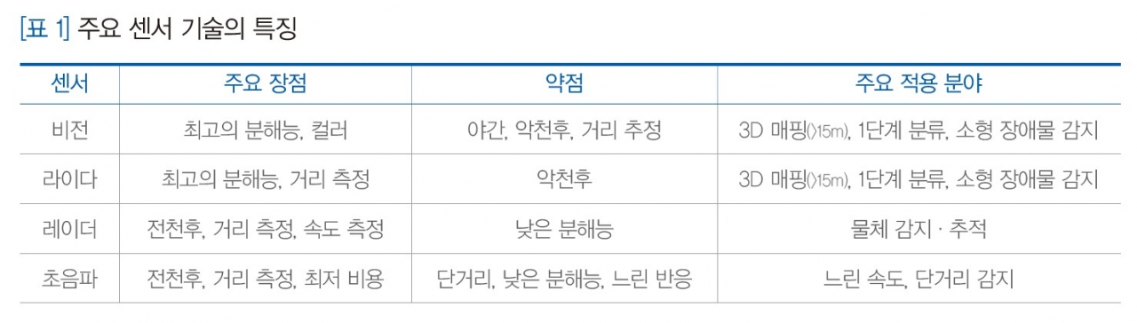 자율시스템은 AI와 알고리즘에 정보를 제공하기 위해 센서 융합 기술로 수집된 충실도 높은 데이터에 크게 의존한다. 이 산업 분야에서는 일반적으로 레이더, 라이다(LiDAR), 비전, 초음파, 관성 센서 등이 활용된다. [표 1]은 각 인지 센싱 기술의 장단점을 나타내며, 이를 통해 여러 센서 기술을 병행 사용해야 함을 알 수 있다.