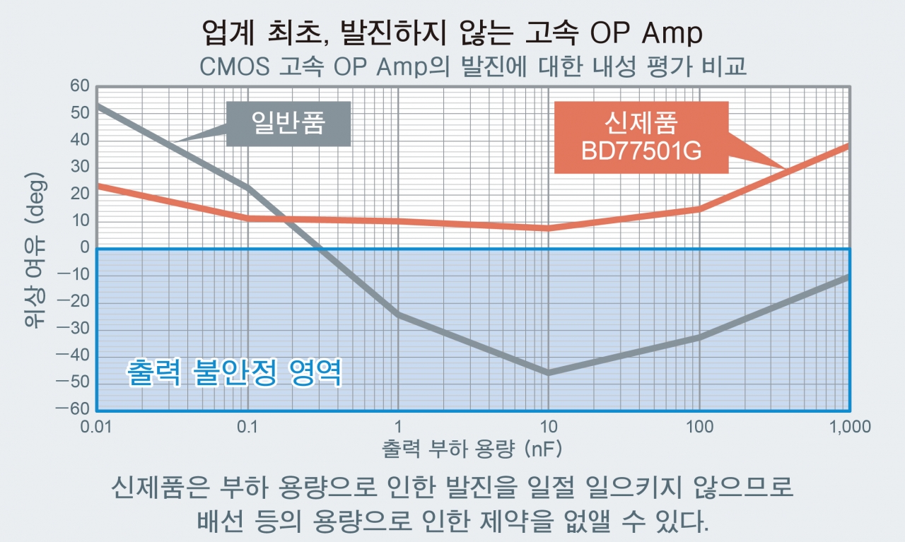 이 신제품은 이상 검출 시스템 등에서 요구되는 고속 증폭(High slew rate 10V/µs)에 대응함과 동시에, 배선 등의 부하 용량에서 전혀 발진하지 않는 OP Amp다. 기존의 고속 OP Amp는 부하 용량에서 발진해 동작이 불안정해지는 경우가 있지만, 이 제품은 발진하지 않으므로 안정적으로 동작할 수 있다.