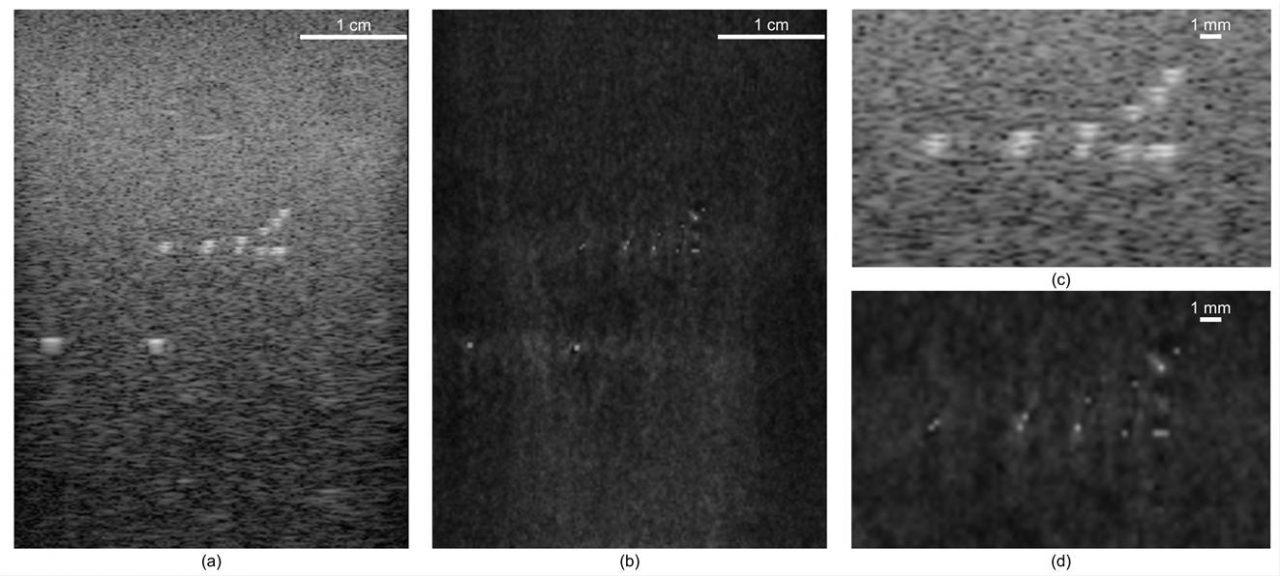 기존에는 국소 부위에 초음파를 집중시키는 빔포밍(Beamforming) 방식이 주로 사용되고 있었으며, 최신 기술의 경우 최대 1mm 분해능의 초음파 영상을 제공한다. 연구팀은 빔포밍이 아닌, 인위적으로 생성한 초음파 파동의 무작위 간섭(Random Interferences)과 수학적 최적화(Mathematical Optimization) 방법을 사용해, 0.25mm 간격의 나일론 와이어를 구분할 수 있는 고해상도 초음파 이미지 촬영 기술을 개발했다.