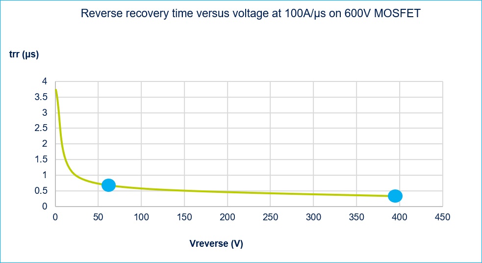 역 회복 전류는 평균 순방향 전류에 따라 좌우되며, ISD가 높을수록 역 회복 전류(Irrm) 피크가 높아진다는 점을 강조할 필요가 있다. ISD가 Irrm으로 하강할 때의 시간 간격과 di/dt는 PCB 레이아웃에 달려 있고, Irrm에서 0으로 상승할 때의 시간 간격과 di/dt는 진성 MOSFET 기술에 의해서만 달라진다. 디바이스의 데이터시트 상에서는 다이오드에 대한 테스트 조건과 Qrr, trr, Irrm 등의 상대적 특성들을 확인할 수 있다[그림 2]. 이 특성들은 모두 VDD(Voltage Drain Drain)의 영향을 받는데, [그림 3]에서 알 수 있듯 VDD가 낮을수록 역회복 시간(trr)이 길어지며 이는 최악의 상태를 의미한다.