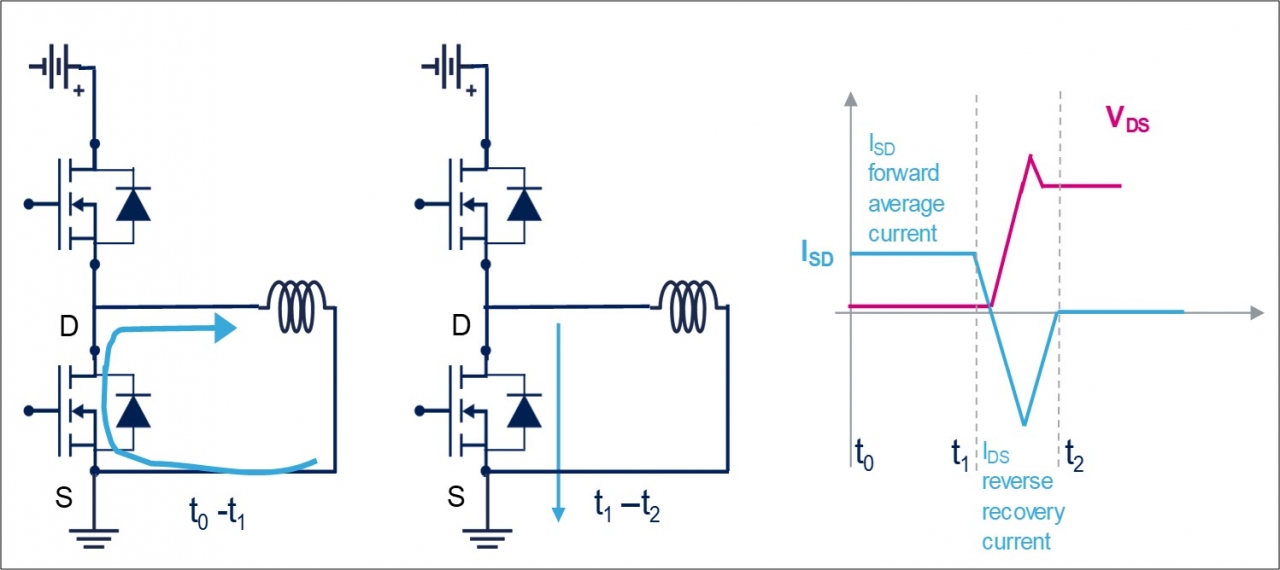 이 토폴로지들은 턴온 시 제로 전압 스위칭(ZVS, Zero Voltage Switching) 조건으로 동작해, 스위치 온(On) 손실을 제거하고 효율을 높이며 히트싱크를 줄이거나 아예 제거한다. 동작을 계속 유지하기 위해서는, 과도한 스트레스가 가해지는 조건에서도 결함에 대한 신뢰성과 높은 내구성을 필수로 갖춰야 한다. 이 모든 것은 일차측 MOSFET에서 가장 민감한 부분인 기생 바디 다이오드 특성에 달려 있다[그림 1].