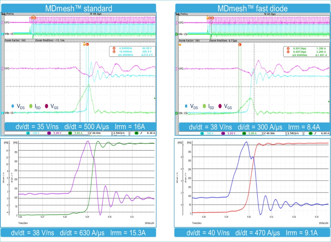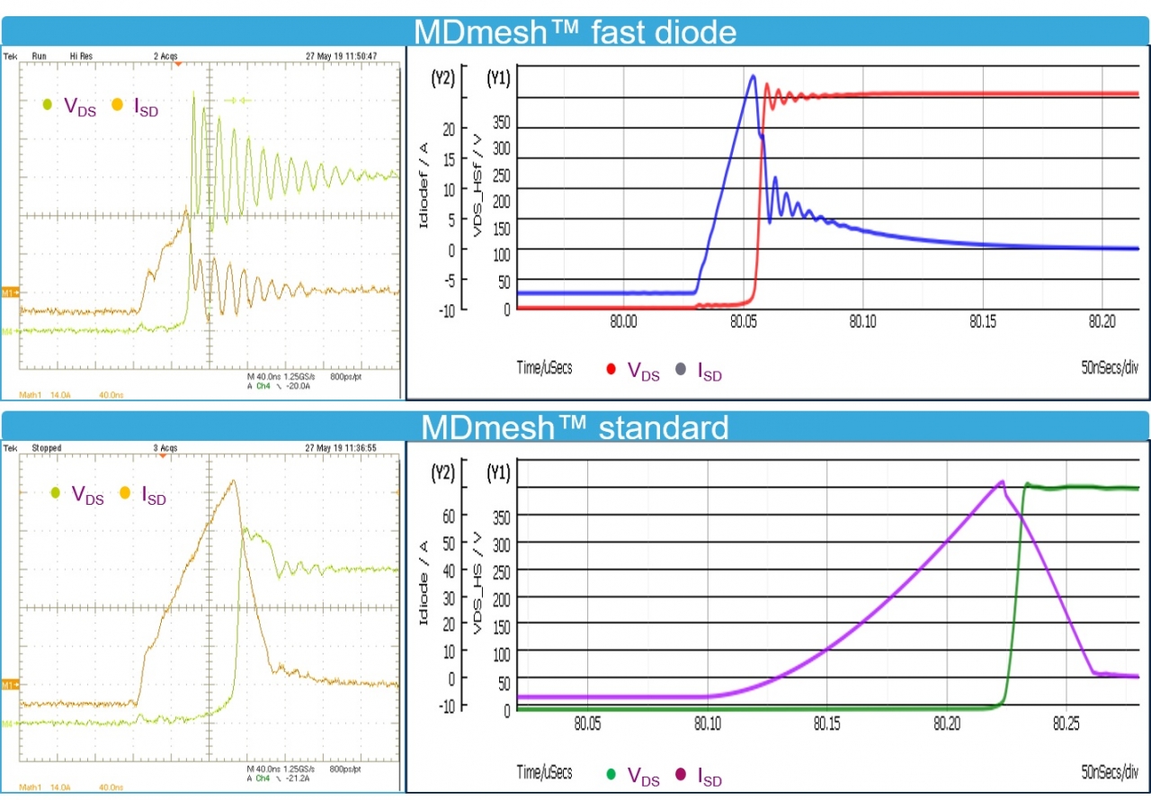 [그림 6]에서 보듯이 동일한 게이트 구동 회로, 동일한 스타트업 조건에서의 시뮬레이션 결과는 실제 측정 결과와 매우 유사하다. 또한, 동일한 MDmesh 기술에 기반한 고속 다이오드 버전을 사용하면, 역 회복 효과를 더 잘 관리하고 데이터시트의 한계 이내로 동작할 수 있다. 이 상황에서 표준 제품을 사용하더라도 결함을 일으키지는 않지만, dv/dt와 di/dt가 데이터시트의 한계를 벗어날 수 있다.