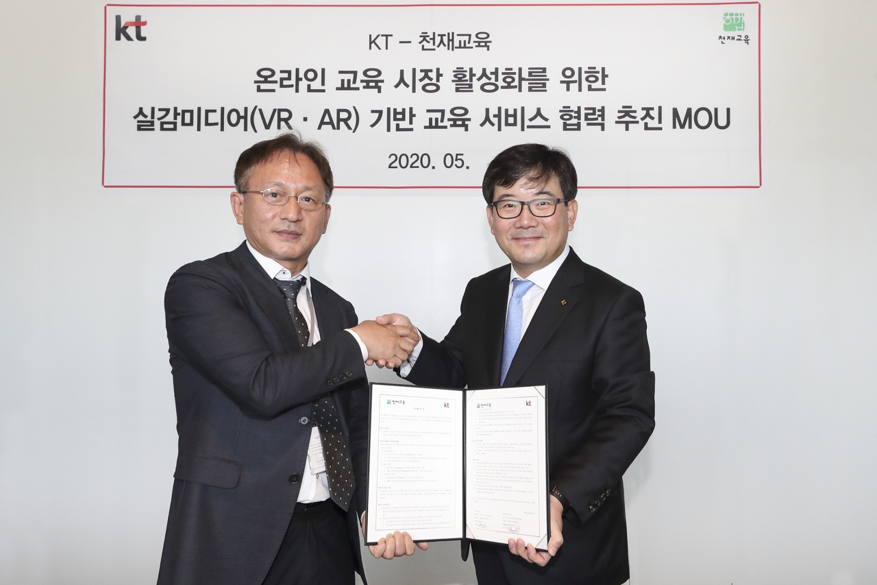 [테크월드=김경한 기자] KT가 코로나19 사태로 인한 비대면 교육의 한계를 뛰어넘기 위해 실감미디어 기반 교육 서비스 개발과 사업화에 나선다. 이를 위해 KT는 5월 27일 서울 광화문 KT East 사옥에서 천재교육과 업무 협약을 맺었다.