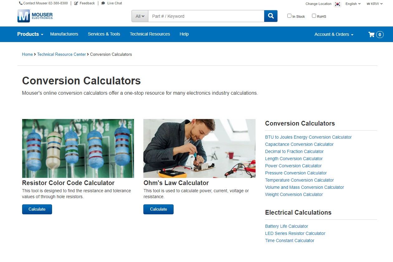 마우저의 변환 계산기는 마우저 홈페이지의 기술 리소스 센터(Technical Resource Center) 내 ‘변환 계산기(Conversion Calculators)’에서 사용할 수 있다.