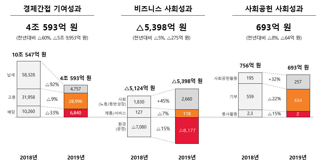 분야별로는 ▲납세, 고용, 배당 등의 ‘경제간접 기여성과’는 4조 593억 원 ▲제품 개발, 생산, 판매 과정 중 사회(노동/동반성장)와 환경 영역의 ‘비즈니스 사회성과’는 -5398억 원 ▲지역사회에 대한 ‘사회공헌 사회성과’는 693억 원으로 나타났다.