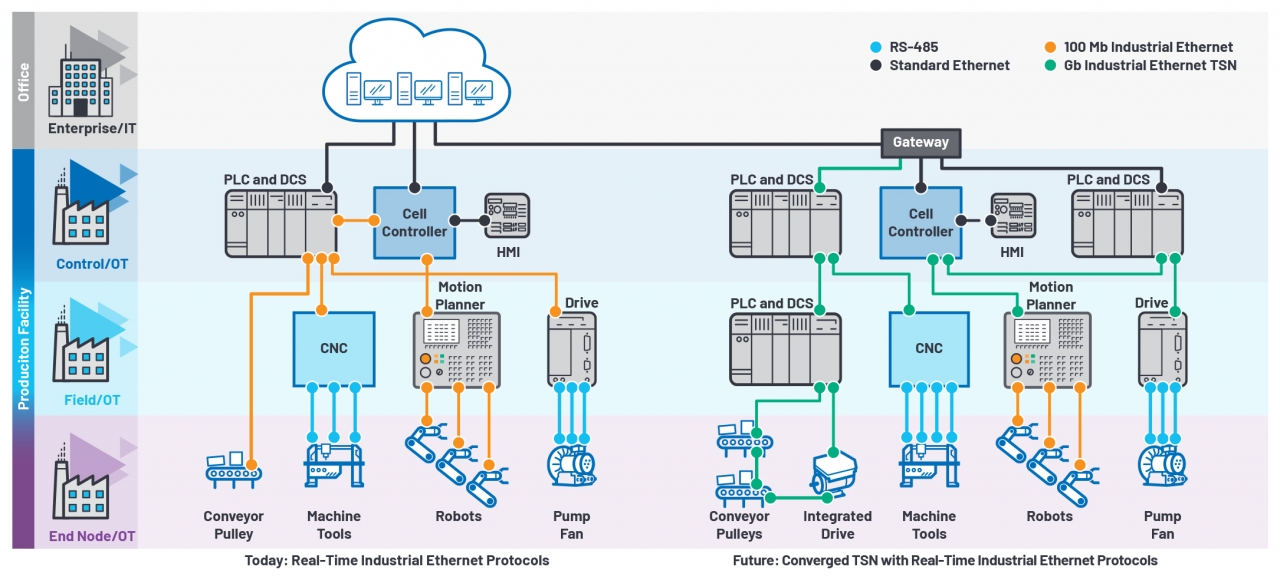 이더넷으로 연결된 공장은 정보 기술(IT)과 운영 기술(OT) 네트워크를 연결함으로써, 제조 생산성을 높이고 더욱 유연하고 확장성 있는 제조 실현을 돕는다. 이를 통해 시간 결정적 통신을 지원하는 원활하고 안전한 통합 고대역폭 네트워크 속에서 공장은 모든 영역을 모니터링하고 제어할 수 있다.