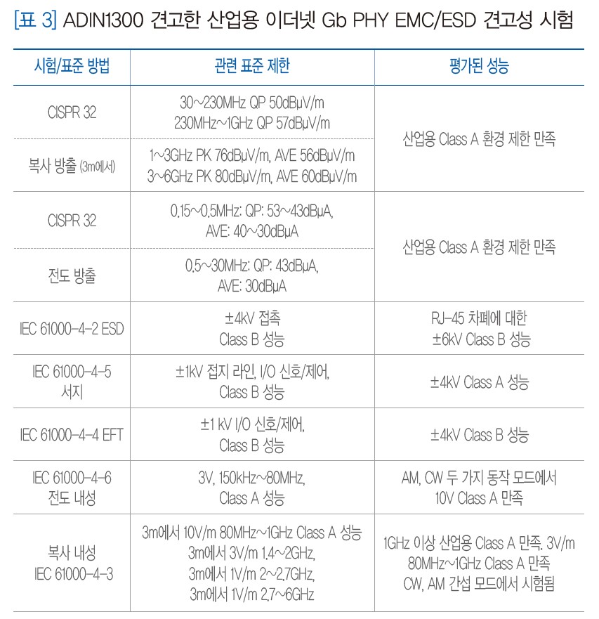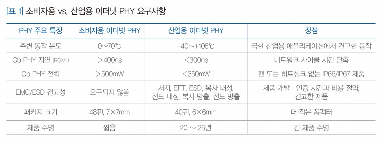 장비는 15년 이상 작동해야 하는 경우도 있어, 산업 장비 제조업체들에게 제품의 수명은 중요한 관심사 중 하나다. 이는 제품 단종이 매우 큰 비용과 시간이 드는 제품 재설계 활동을 수반함을 의미한다. 산업용 이더넷 PHY 디바이스는 긴 제품 수명을 지원해야 하지만 소비자용, 대량 시장 이더넷 PHY 공급업체에 의해서는 지원되지 않는 경우가 많다. 견고한 산업용 이더넷 애플리케이션을 위한 산업용 이더넷 PHY 요건은 [표 1], [표 2], [표 3]을 통해 확인할 수 있다.