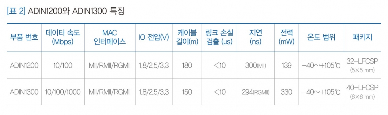 아나로그디바이스(이하 ADI)는 극한의 산업 조건 속에서, 최대 105℃의 넓은 온도 범위로 신뢰성 있게 동작하는 산업용 이더넷 PHY 2종을 출시했다. ADI는 긴 제품 수명을 보장하기 위해 노력하고 있으며, 이 글을 통해 알아본 과제 해결에 적합한 ADIN1300, ADIN1200의 PHY 특징은 다음과 같다. 특징 요약은 [표 2]를 참고하면 된다.