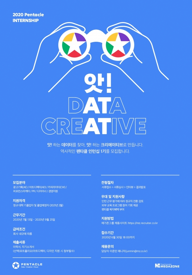 차상훈 펜타클 부사장은 “이번 인턴십은 펜타클 출범 이후 처음 하는 공개채용으로, 핵심가치인 데이터 기반의 크리에이티브를 통해 국내 광고산업에서 디지털 혁신을 이룰 인재들의 지원을 기대한다”고 전했다.