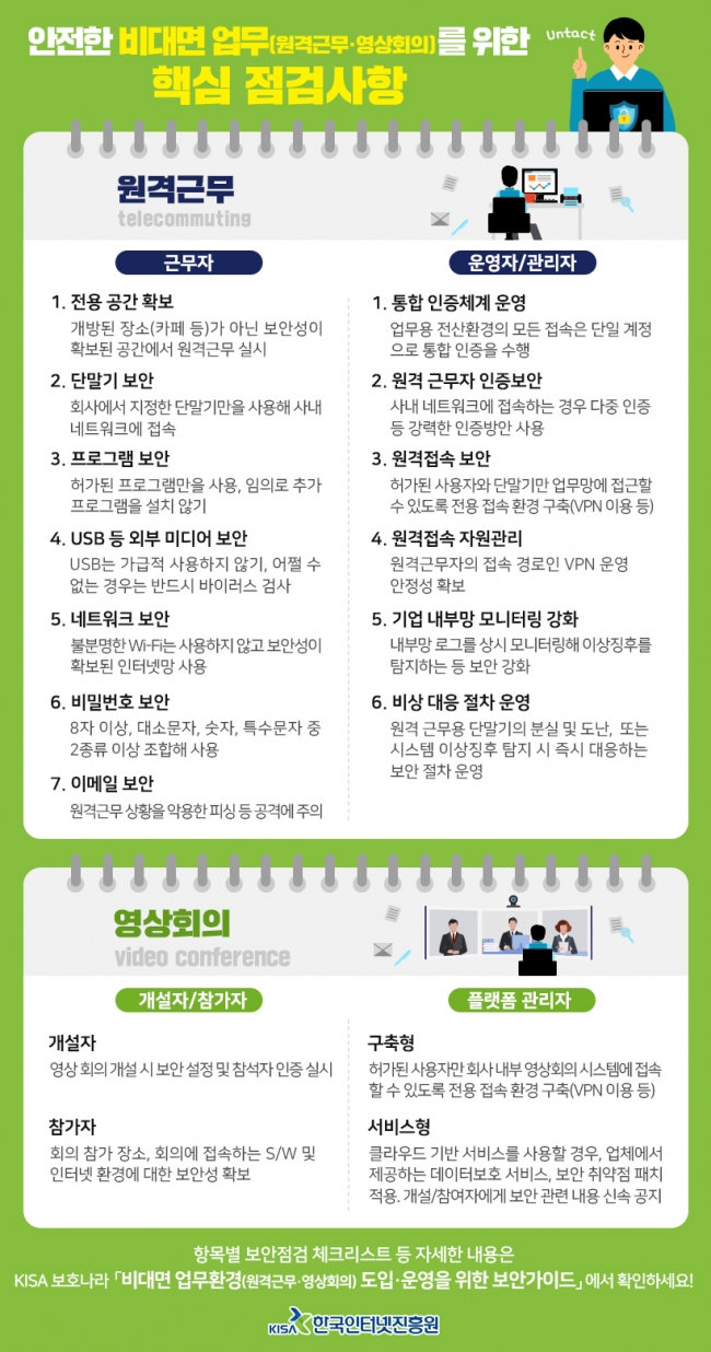 한국인터넷진흥원(이하 KISA)이 코로나19로 확대되고 있는 원격근무·영상회의 등 비대면 업무환경에서의 침해사고를 예방하기 위해 ‘비대면 업무환경 도입·운영을 위한 보안 가이드’을 배포한다.