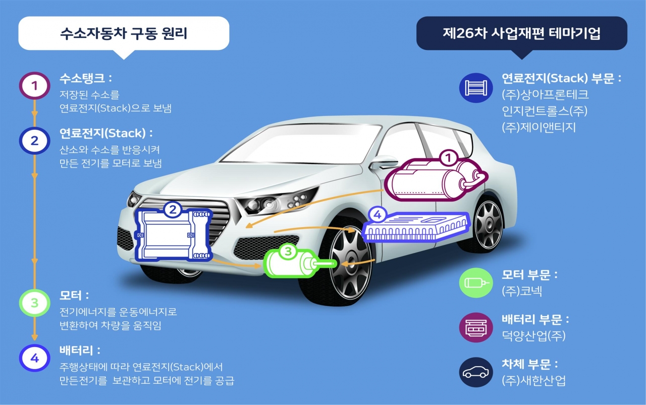 금번 사업재편을 통해 6개의 자동차 부품 업체가 내연기관차에서 친환경차 산업생태계로 진출한다. 6개 중견·중소기업은 수소연료전지 분야의 상아프론테크와 제이앤티지, 하우징 분야의 코넥, 냉각조절장치 분야의 인지컨트롤스, 배터리 분야의 덕양산업, 차체 분야의 새한산업이다.