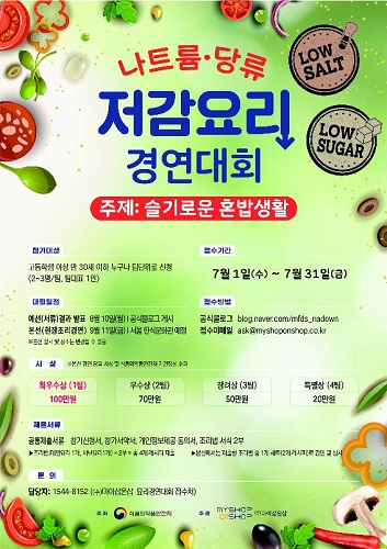 경연 주제는 '한 끼 식사 나트륨·당류 저감과 영양을 고려한 혼밥 레시피'이며, 만 15세 이상 30세 이하의 팀 단위로 7월 한 달간 온라인을 통해 신청할 수 있다.