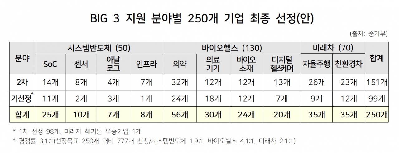 [테크월드=선연수 기자] 중소벤처기업부(이하 중기부)가 3년간 집중 육성할 BIG3 분야의 성장 잠재력을 가진 스타트업과 벤처기업 250개사를 선정 완료했다고 발표했다.