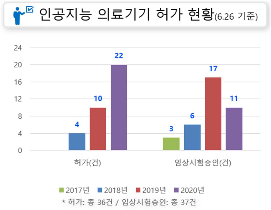 식약처는 그동안 인공지능 의료기기 개발을 지원하고 선도적인 규제환경을 조성하기 위해 다양한 노력을 기울여 왔다. 2017년 세계 최초로 인공지능 의료기기 허가 심사 가이드라인을 마련하는 등 총 6개의 가이드라인을 발간함으로써 국내에서 15개사 36개의 인공지능 의료기기를 허가할 수 있는 기반을 마련했다.