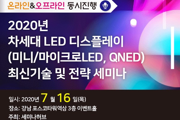[테크월드=선연수 기자] 오는 16일 세미나허브가 미래 LED 기술을 다루는 '2020년 차세대 LED 디스플레이(미니/마이크로LED, QNED) 최신기술 및 전략 세미나'를 연다. 이번 세미나는 온라인, 오프라인 동시 진행된다.