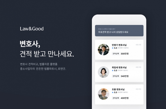 민명기 로앤굿 대표는 “법률수요는 비즈니스 영역에 가장 많음에도 불구하고, 중소사업자들은 분쟁의 규모가 작다는 이유로 전통적인 법률시장에서 외면 받아온 것이 사실”이라며 “합리적인 가격으로 양질의 법률서비스를 받고자 하는 중소사업자들과, 광고보다는 실력으로 승부하고자 하는 변호사들의 니즈를 모두 충족하고 싶다”고 포부를 밝혔다.
