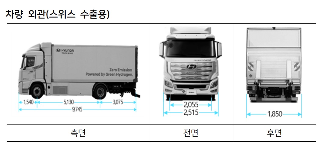 수소화물차는 차량 총중량(트레일러 무게 포함) 34톤 수준, 수소연료전지 출력 190kW, 구동모터 350kW, 1회 충전주행거리 약 400km 등의 성능을 갖추고 있다. 현대차는 이번 수소화물차 10대 수출을 시작으로 2025년까지 누적 1600대를 스위스로 수출할 예정이다.