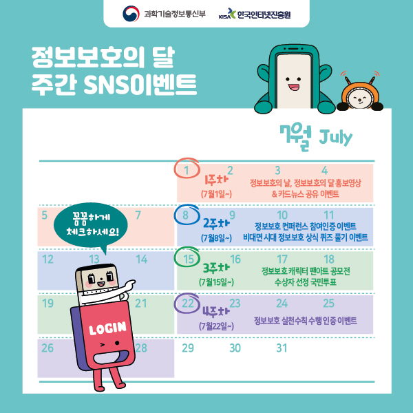 7월 첫째 주(7.1~7.7)에는 정보보호 캐릭터인 로긴·이디·퓨를 활용한 캐릭터 팬아트 공모전이 개최된 바 있으며, 7월 둘째 주부터 보안상식 퀴즈 이벤트, 정보보안 10대 실천수칙 인증 캠페인 등이 차례로 열린다.