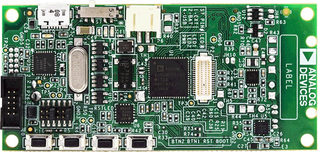 ARM Cortex-M4F 프로세서에 기반한 ADI의 마이크로컨트롤러(MCU) ADuCM4050은 전력 사용을 절감해주는 통합형 MCU 시스템이다. 전원관리, 데이터 포착, 프로세싱, 제어 등 커넥티비티를 위한 아날로그·디지털 주변장치 기능을 포함하고 있다. 이런 기능들로 AI 알고리즘을 이용한 로컬 데이터 프로세싱이나 데이터 정제 용도로 사용하기에 적합하다.
