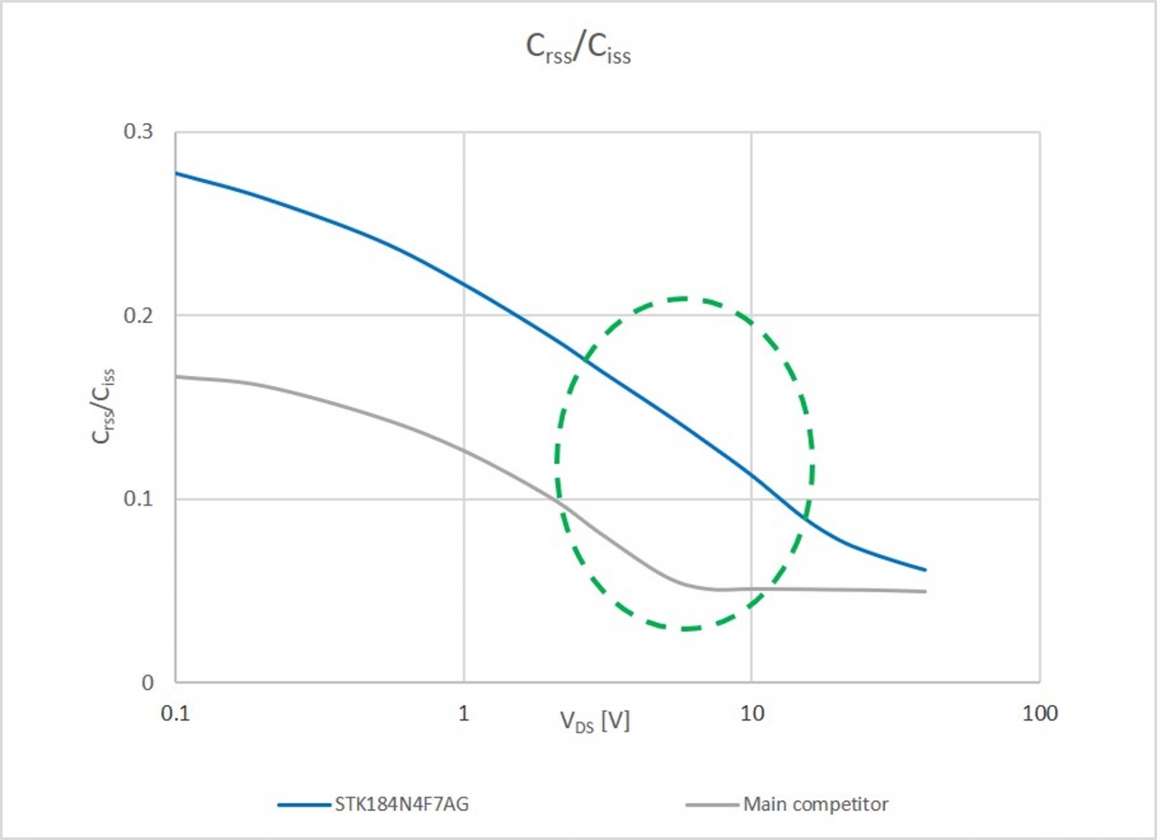분석 결과, 두 기기의 입력 커패시턴스 대비 역 커패시턴스 비(Crss/Ciss)를 확인할 수 있다. 이 커패시턴스 비는 과도 상태 단계 동안 di⁄dt, dv⁄dt의 전력 MOSFET 제어 성능을 보여주는 지표다. [그림 1]을 보면 타사 기기는 전압 대비 급격한 용량 감소를 나타내고 있고, STPOWER STripFET F7 STK184N4F7AG는 완만한 변화를 보여주는 것을 확인할 수 있다.