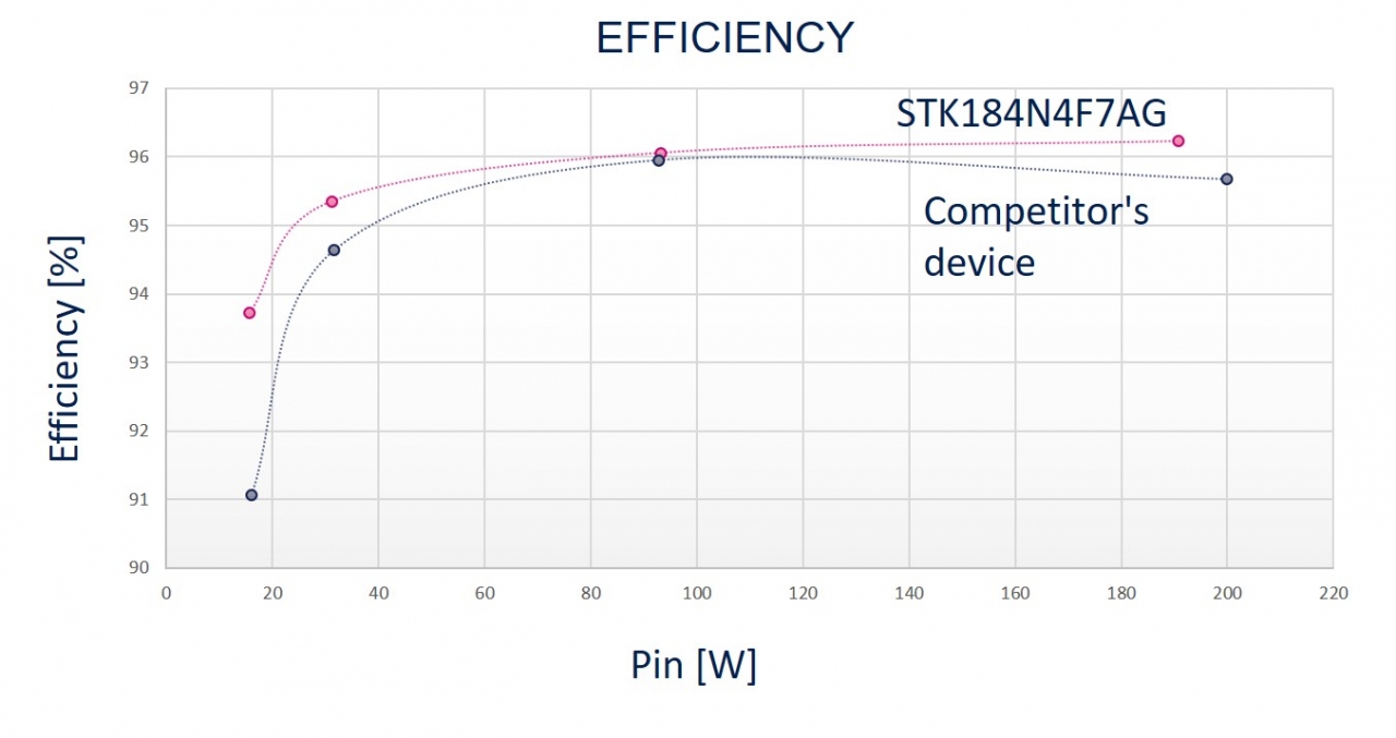 시스템 손실을 정량화하고 효율 곡선을 생성하기 위해 Aron, 전압-전류계를 모두 연결했다. 표준 수동 전압 프로브 키트로는 디바이스 파형을 측정한 결과, STK184N4F7AG는 전체 전력 부하 범위에서 더 높은 효율을 달성하는 것을 알 수 있다[그림 3].