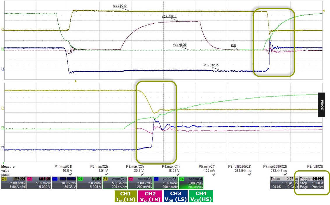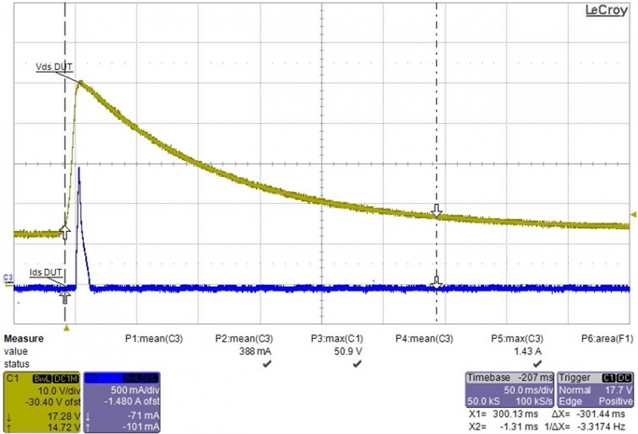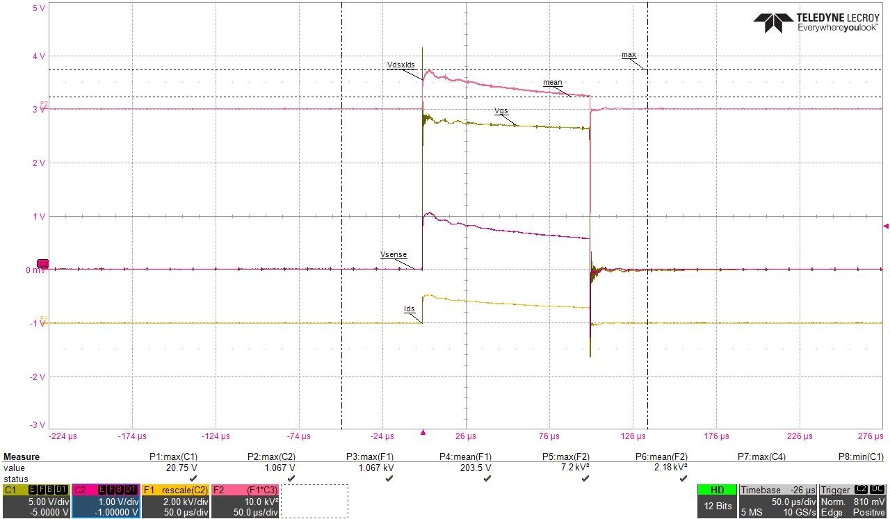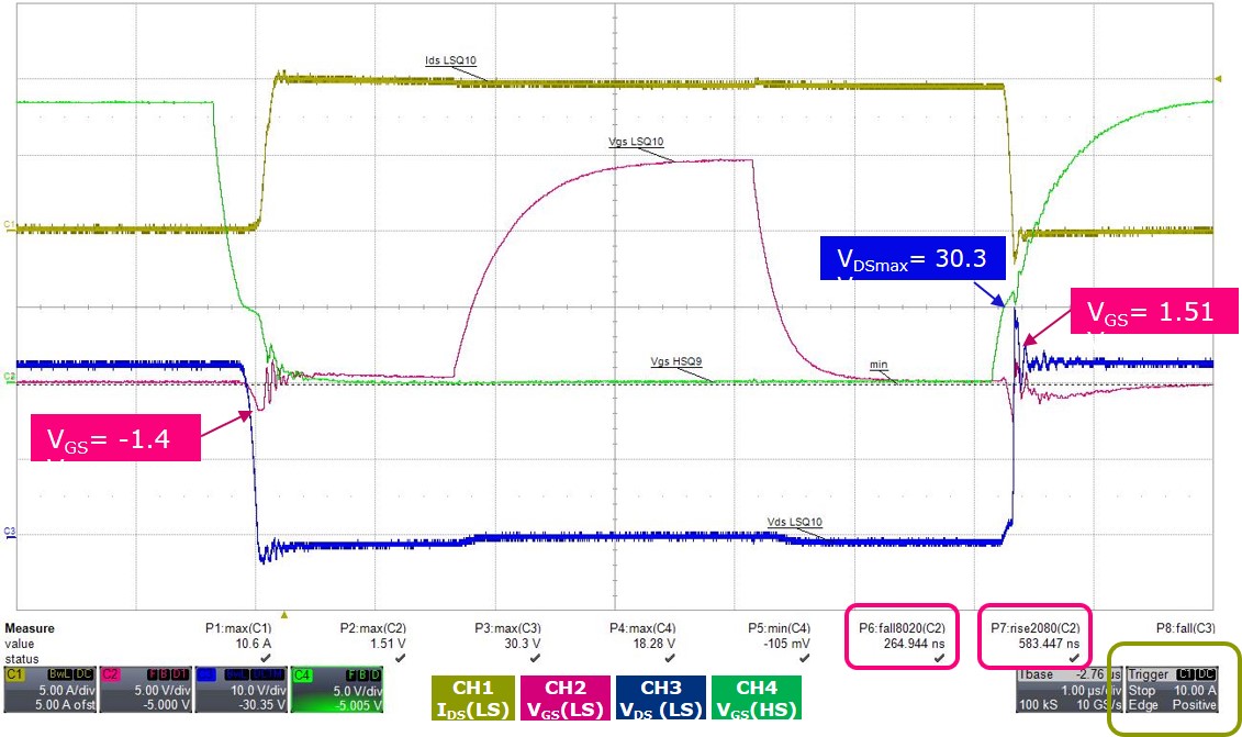 측정된 파형을 살펴보면 STK184N4F7AG는 정류 단계에서 이상을 보이지 않는다. 게이트-드레인 커패시턴스(CGD)의 값이 낮아 밀러(Miler) 효과로 인한 게이트-소스 전압(VGS)의 글리치 전압도 낮다. 이로 인해 MOSFET 스위칭에 아무런 영향을 주지 않는다.
