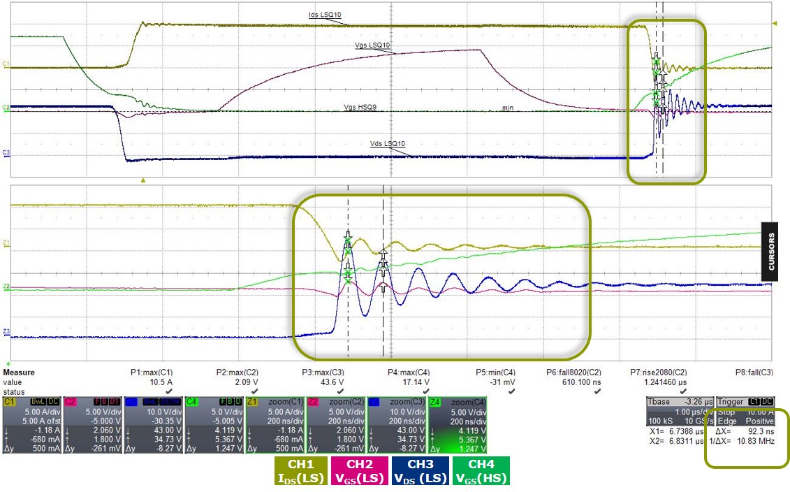 프리휠링(Freewheeling) 단계 동안 바디 드레인 다이오드 복구 파형은 2A와 같이 낮은 피크 전류를 나타낸다. 다이오드의 매끄러운 특성으로 인해 전류는 특정 발진을 보이지 않는다. [그림 6]은 타사 기기가 2A의 피크 전류를 갖는 프리휠링 단계동안 진행하는 바디 드레인 다이오드 복구를 보여준다. 확대된 파형은 정류 단계 동안의 링잉을 보다 자세히 보여준다. 다이오드의 매끄러운 특성을 ST 제품보다 낮고, 발진은 EMI/EMC 민감성에 심각한 영향을 줄 수 있다.