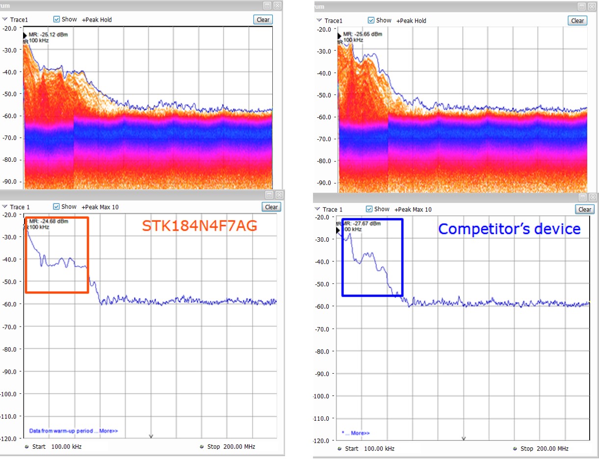 100~300kHz 대역에서 시행된 EMI 테스트에서 타사 기기는 STK184N4F7AG 대비 높은 노이즈 피크를 보여준다[그림 7].