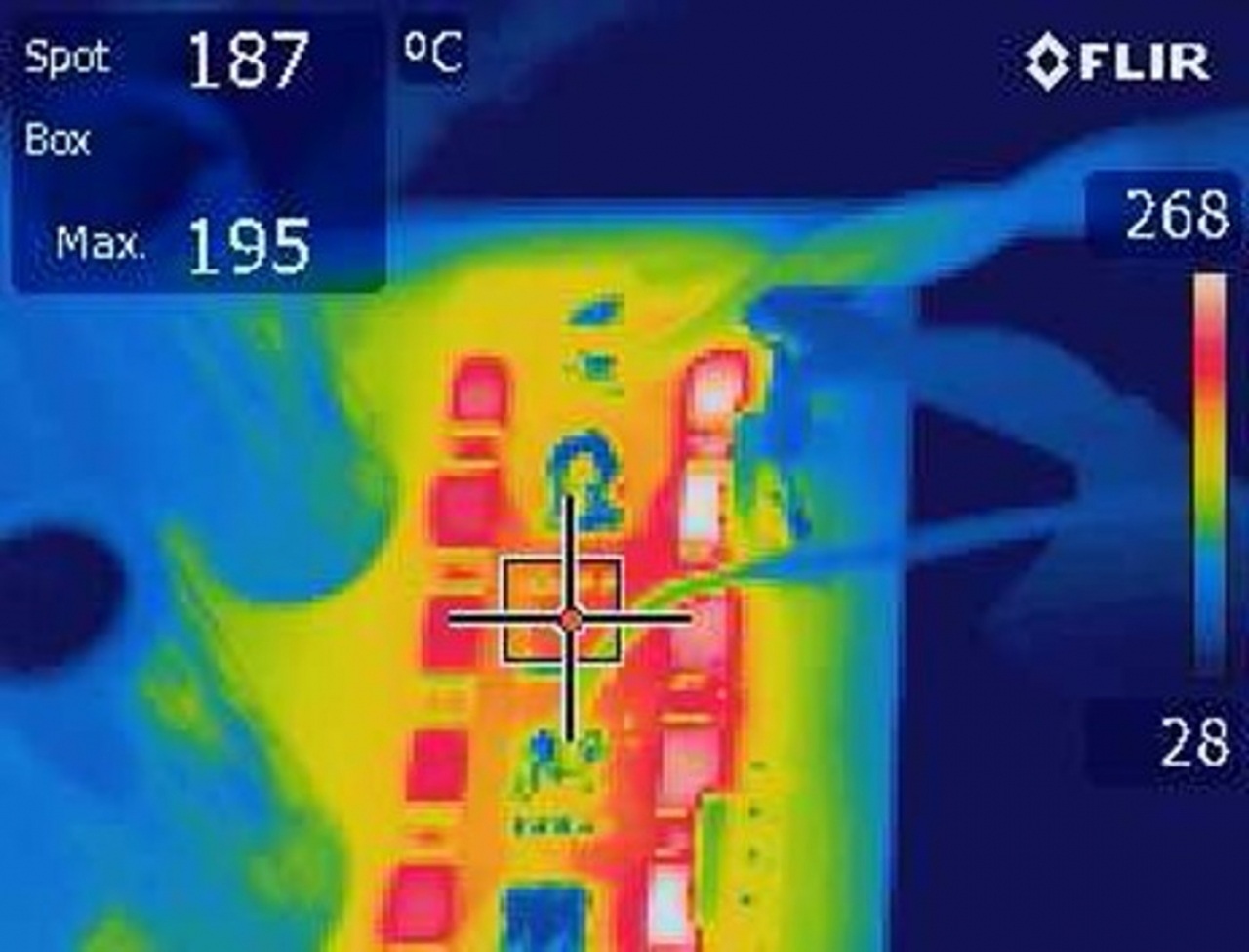 [그림 9]는 고온에서 단락 회로 테스트를 진행하는 동안, IR 열화상 카메라로 촬영한 열화상 사진이다.