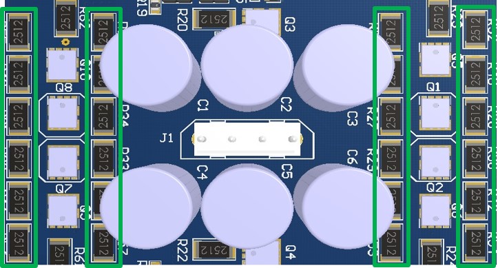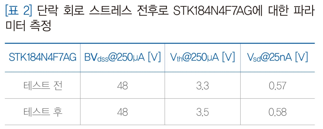 보드에 열을 가하기 위해 0~12V의 정전압 발생기로 일부 SMD 저항(0.001Ω)에 바이어스했다. 여기서 8개 레그(Leg)가 병렬 연결됐고 각 레그는 3개의 직렬 저항으로 구성됐다. 이는 [그림 10]의 녹색 부분을 통해 확인할 수 있다. 전력 소모는 기기 주변 온도를 목표치까지 증가시킨다. [표 2]는 기기를 4000펄스 시퀀스에 노출시킨 후, 주요 전기 파라미터를 단락 회로 스트레스 전과 후로 측정한 것이다.