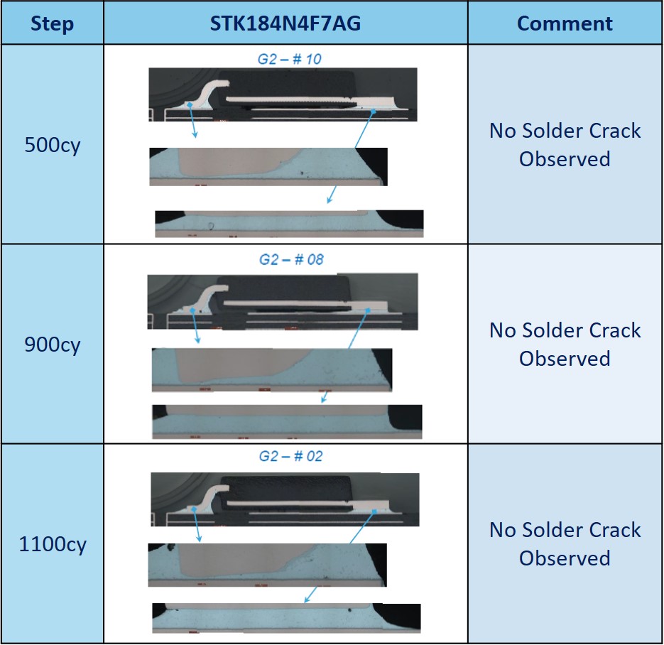 STK184N4F7AG는 온도 사이클을 통해 솔더 접합 안정성을 검증했으며, [표 3]은 그 결과를 3단계(500, 900, 1100사이클)로 기록한 것이다.