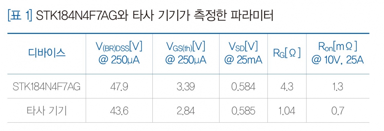모터 제어 애플리케이션의 벤치마크를 사용해 STK184N4F7AG와 유사 패키지의 타사 제품을 비교해보자. 테스트는 24V 버스전압, 16kHz 스위칭 주파수, 3션트 구성으로 자속 기준 제어(Field Oriented Control) 기법을 적용해 PWM 제어로 수행됐다. 각 제품의 전기 파라미터는 [표 1]과 같다.